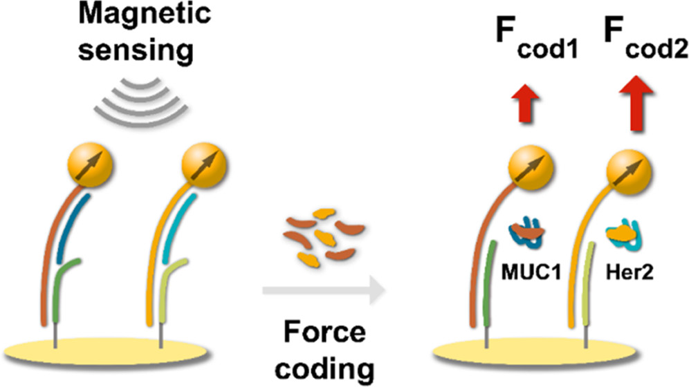 Multiplexed simultaneous detection of various cancer markers is required for accurate diagnosis and treatment of early cancer. In this work, we present a force-coded strategy for the simultaneous detection of tumor-related proteins with tunable dynamic range via magnetic sensing. The multiplexing capability of this method is achieved by designing DNA devices that can recognize different biomarkers and code them with different binding forces measured by the force-induced remnant magnetization spectroscopy, which is not influenced by the color of the light and the solution. Moreover, the force-coded assay with high sensitivity and adjustable detection range is robust, which could be used for practical biological applications such as magnetic sensing, handheld miniaturized systems, and potential in vivo diagnosis.